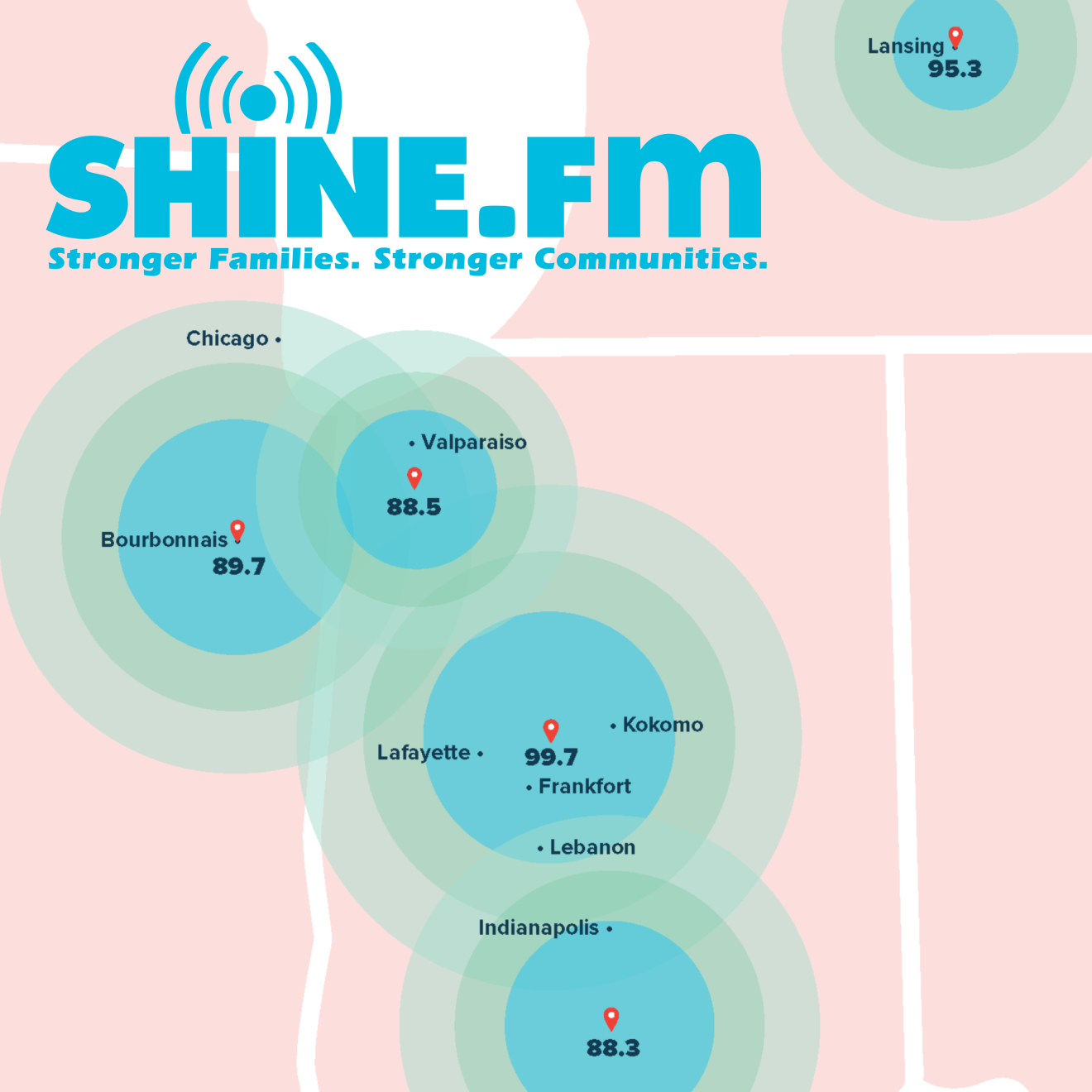 Shine.FM is a dynamic Christian radio network dedicated to fostering stronger families and communities through the power of music and shared experiences. Shine.FM is based in central Indiana and broadcasts on multiple frequencies including 99.7 FM which reaches a diverse audience across Lafayette, Frankfort, Kokomo, and Lebanon. The station's mission revolves around building relationships that positively influence people for Christ, using music as a catalyst for community connection and spiritual growth.